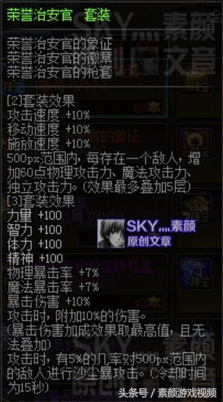 荣誉治安官套装是最新的五一活动地下城所奖励的传说特殊装备,整体来说,这套装备的属性还算不错,对三速、暴击率和面板有着不错的加成,同时还可增加暴击伤害和白字伤害,与之前我们在体验服所看到的属性比起来,应该是加强了不少。