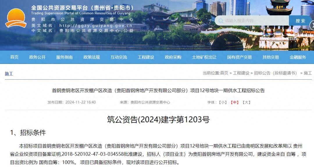 11月22日,贵阳市公共资源交易中心发布文首钢贵钢老区开发棚户区改造(贵阳首钢房地产开发有限公司部分)项目12号地块一期供水工程招标公告。