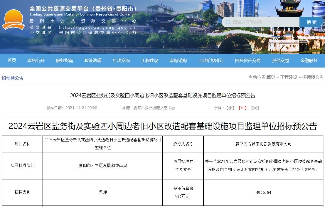 11月21日,贵阳市公共资源交易中心发布2024云岩区盐务街及实验四小周边老旧小区改造配套基础设施项目监理单位招标预公告。
