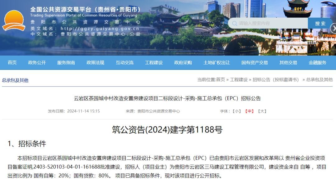 11月20日,贵阳市公共资源交易中心发布云岩区茶园城中村改造安置房建设项目一标段、二标段设计-采购-施工总承包(EPC)招标公告。
