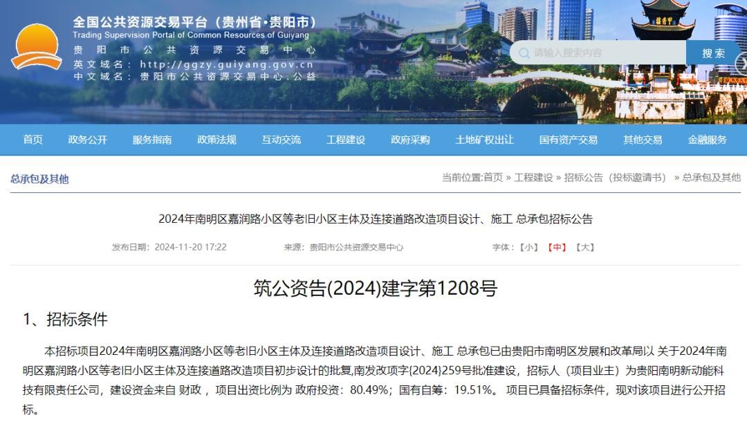 11月20日,贵阳市公共资源交易中心发布2024年南明区嘉润路小区等老旧小区主体及连接道路改造项目设计、施工(EPC)总承包招标预公告。
