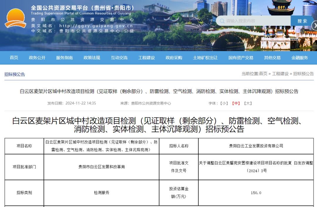 11月13日,贵阳市公共资源交易中心发布白云区麦架片区城中村改造项目检测(见证取样(剩余部分)、防雷检测、空气检测、消防检测、实体检测、主体沉降观测)招标预公告。