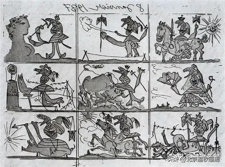 尽管毕加索已经是一位著名的左派分子,例如他创作了一对蚀刻版画,名为《佛朗哥的梦想与谎言》(1937 年),为共和国筹集资金而被复制和出售。但轰炸对他的打击尤为强烈。5月1日,他来到位于大奥古斯丁街的工作室,开始为委托绘制新的草图。