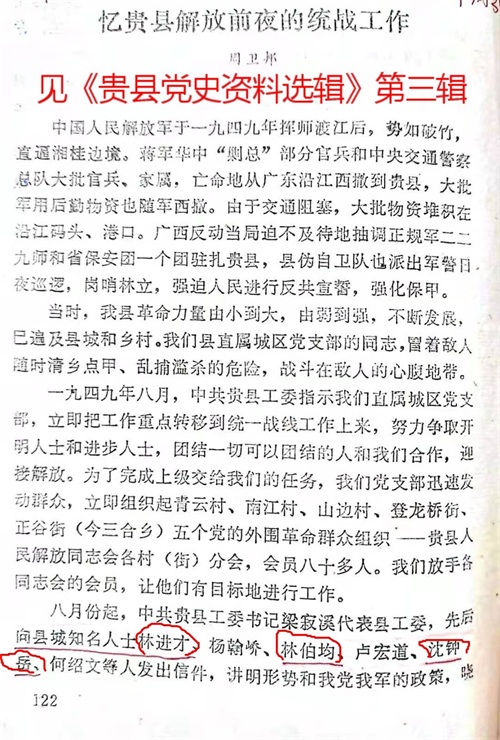 1949年,贵县解放前夜,梁寂溪书记代表中共县工委,先后向林进才等知名人士发信。后来周卫邦以党代表身份接触“城区治安委员会”副主任林伯均时,林进才也在场。父子两人都对国民党反动派的腐败深为不满,最后以实际行动,对贵县和平解放作出贡献。
