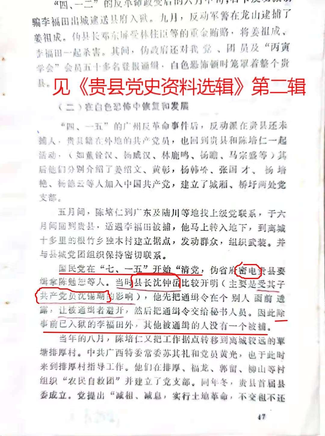 2、沈毓卿(即沈钟岳,笔者爷爷),早年留学日本,归国后曾两度出任贵县县长和横县、岑溪等县县长。1927年“4·12”反革命事变后,他在接到省府拍来要抓捕中共党员陈勉恕等人的密电后,有意使人透露消息,让这批社会精英走避。1949年,沈公对党的统战工作给予支持配合,为解放军顺利入城解放贵县创造了条件。