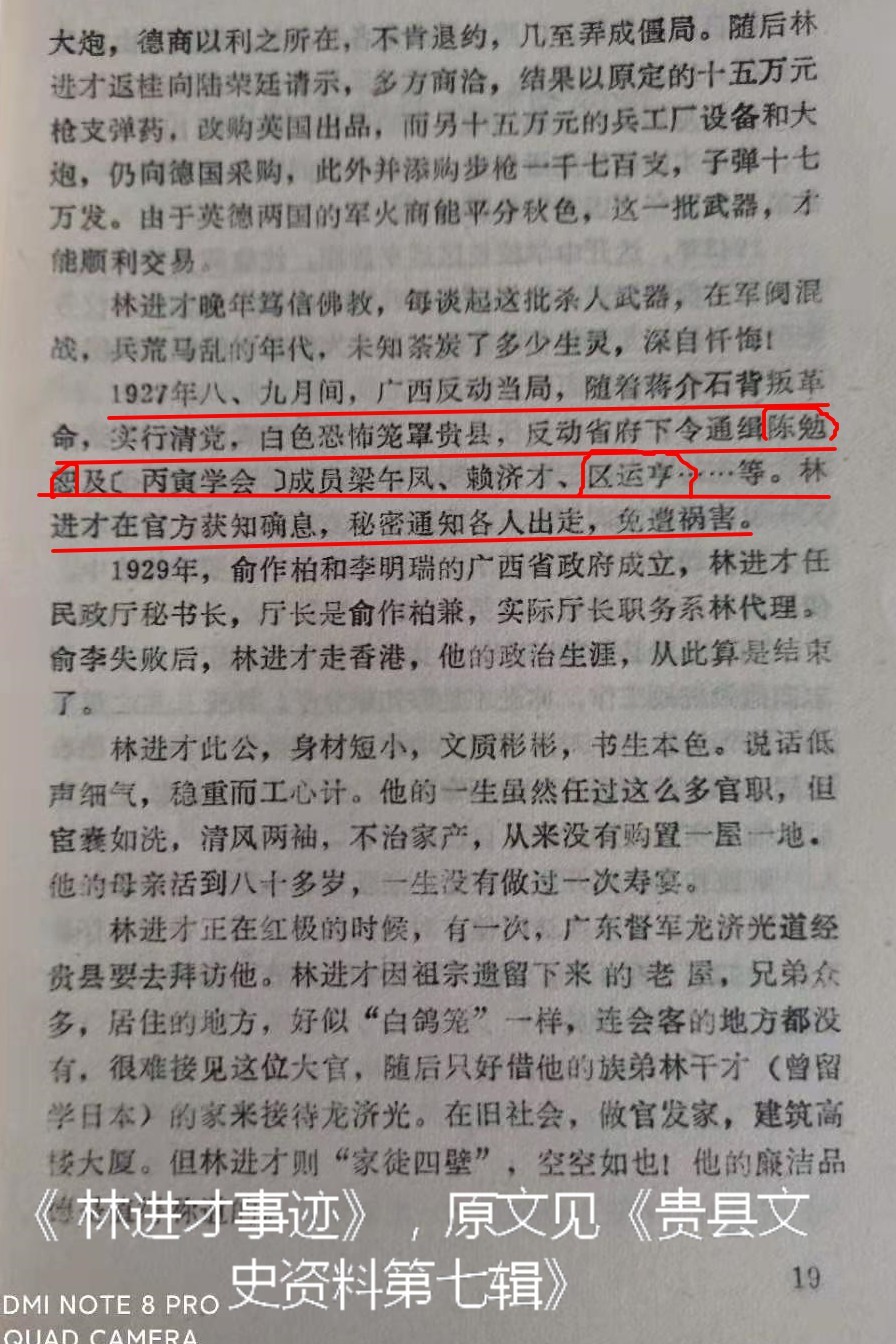 1927年“4.12”后,省府下令通辑中共党员陈勉恕及丙寅学会成员罗润亭、梁午凤、赖济才、区运亨(即达中第二任校长区隐乾)等人。林进才在“官方”获知确实消息后,设法秘密通知各人出走,免遭祸害,时任县长正是沈毓卿。
