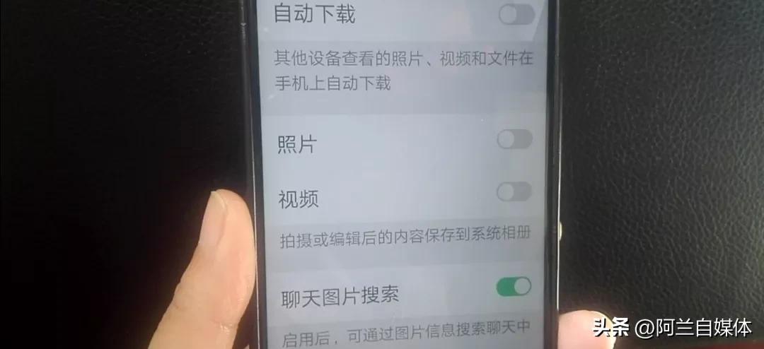在这里大家可以看到这些按钮都是系统默认打开的状态,第一个是“自动下载”,其他设备查看的照片、视频和文件在手机上会自动地下载,因此我们要把这个按钮点一下变成灰色,就把这个自动下载的功能关闭了。第二个是“照片”,第三个是“视频”,我们也要把后边绿色按钮点一下变成灰色,这样就把这两个功能也关闭了,那么我们拍摄或编辑后的内容就不会自动保存到系统相册。关闭了微信的这三个开关后,就会节省我们的手机内存空间,就不会自动下载、自动保存了,因此大家一定别忘了在这里把这三个开关关闭了。
