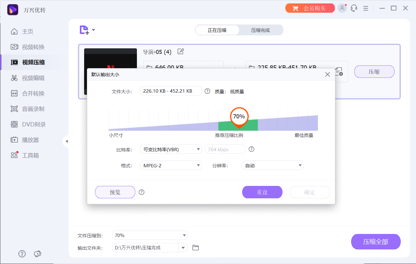 导入视频后,在缩略图右侧点击设置按钮,在新的弹窗中可以对视频的比特率、帧速率等参数进行设置。如果你觉得麻烦,也可以直接拖动压缩条来快速进行大小调整,上面还会标识最佳的压缩区间。