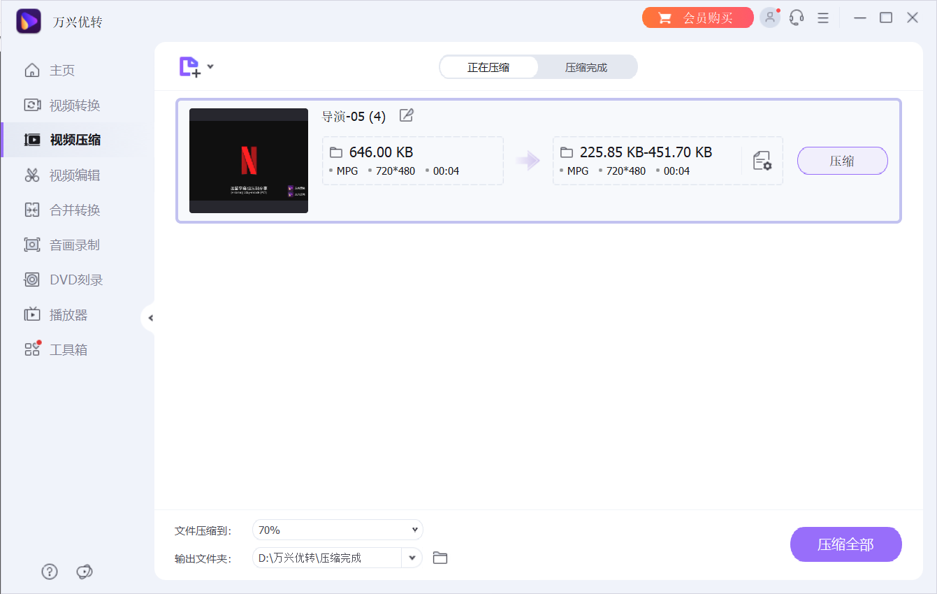 全部设置完以后,点击压缩按钮就可以快速压缩视频文件。如果你导入的是批量视频,那就点击压缩全部按钮。