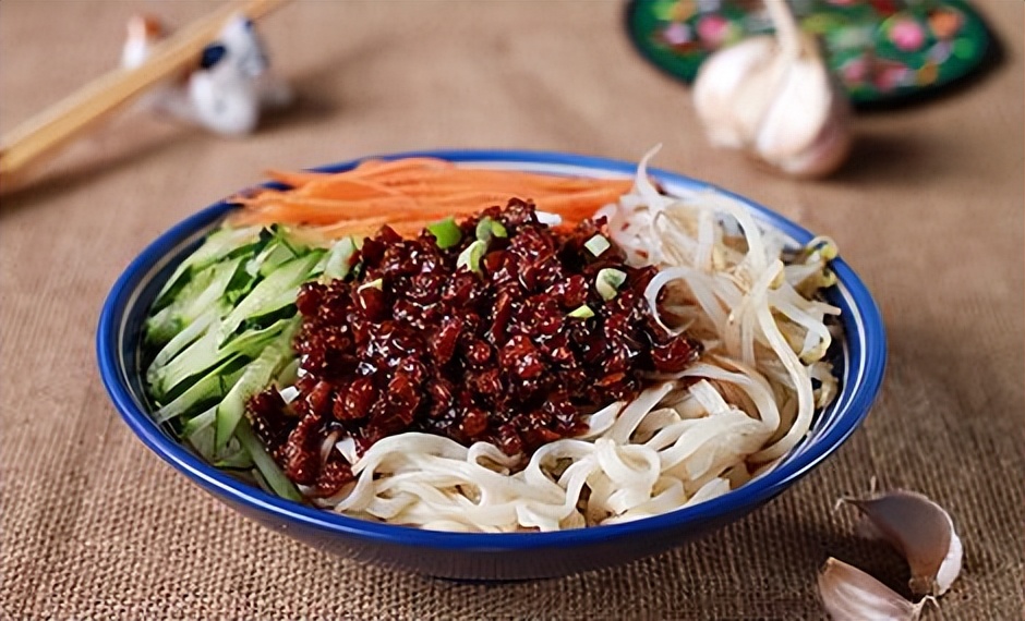 流行于北京等地,由菜码、炸酱拌面条而成。将黄瓜、香椿、豆芽、青豆、黄豆切好或煮好,做成菜码备用。然后做炸酱,将肉丁及葱姜等放在油里炒,再加入黄豆制作的黄酱或甜面酱炸炒,即成炸酱。面条煮熟后,捞出,烧上炸酱,拌以菜码,即成炸酱面。也有面条捞出后用凉水浸洗再加炸酱、菜码的,称“过水面”。