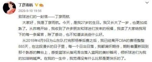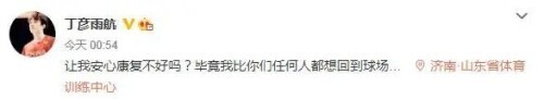 今年2月,齐鲁网记者发布了一段关于丁彦雨航的聊天记录,丁彦雨航写道:“那天跑田径场把大腿拉了,我把自己跑哭了,已经三年没全力跑过了。”