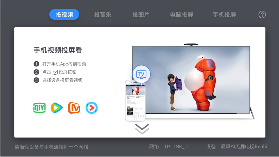 正确连接后电视屏幕则会出现对应的二维码和操作流程,无需额外安装APP使用。