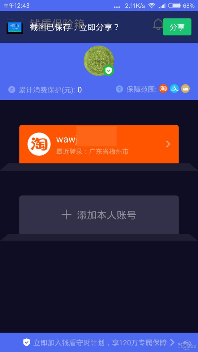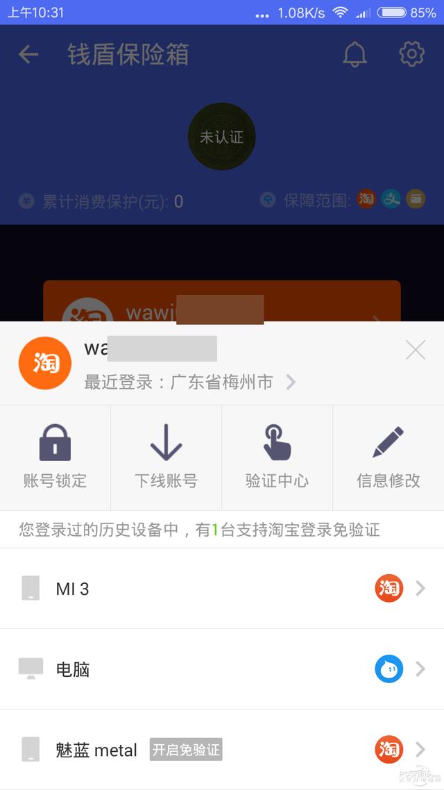 将淘宝账号纳入钱盾保护后,你就可以在钱盾的保险箱中管理该账号了。如进行账号锁定(除非解锁,任何人即使知道账号密码也无法进行登录操作)、下线账号、账号验证、信息修改(修改密码)、查看已登录设备等操作。此外,对于纳入保护的账号,在账号异常时钱盾会第一时间通知用户。