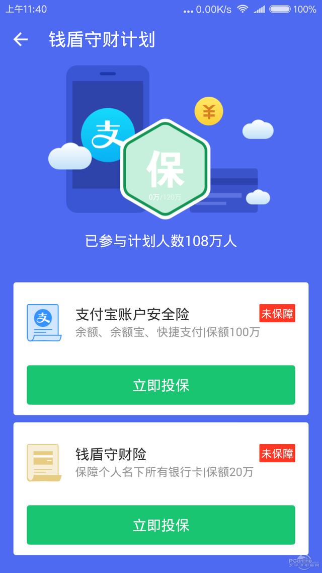 进入钱盾保险箱就可以看到加入钱盾守财计划的提醒,点击进入后就可以自由参保,划分为了支付宝账户安全险和钱盾守财险,分别是针对用户名下的支付宝账户和银行卡账户,其中淘宝、支付宝账户累计最高赔付100万,银行卡累计最高赔付20万。