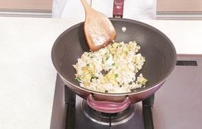 6 掀开锅盖,倒入备好的米饭,压散。