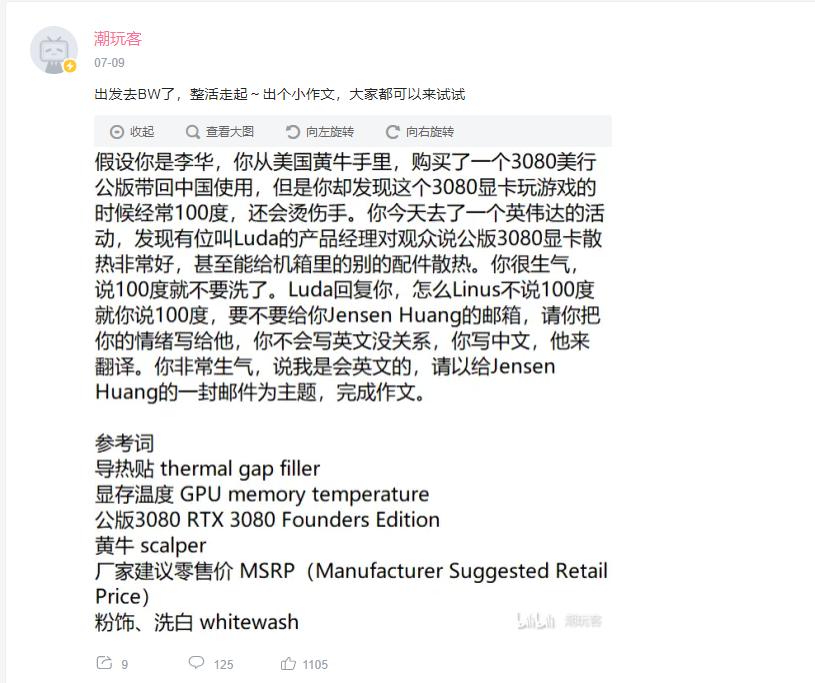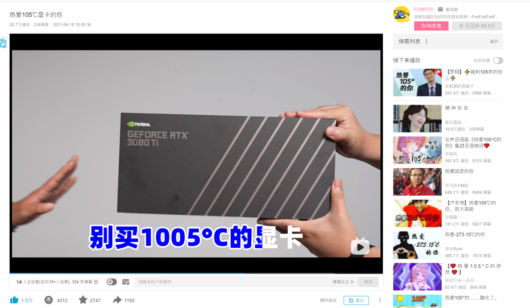 所以我针对英伟达的批评是完全基于产品现实的,并没有任何恶意攻击的成分。后来Fun科技也以100度结合歌曲创作了 热爱105度显卡的你