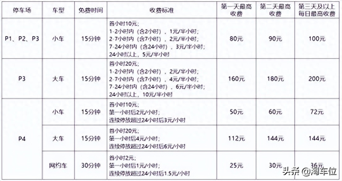 15分钟内免费,第一小时收费10元,1到2小时内(含2小时),1元/半小时;2-7小时内(含7小时),2元/半小时;7-24小时内(含24小时),3元/半小时;24小时以上,5元/半小时。第一天最高收费80元,第二天最高收费90元,第三天及以上每日最高收费100元。