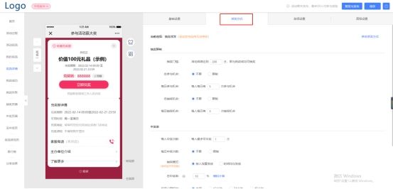 3. 在【派奖方式】选项框中,可对抽奖限制以及中奖率进行设置,其中包括抽奖门槛、总抽奖机会、每日抽奖机会以及总中奖率、抽奖模式、每人中奖次数等可进行设置与完善。