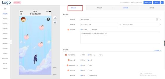 2. 在【基础设置】选项框中,可针对活动标题、活动时间、活动说明以及活动参与条件进行设置。