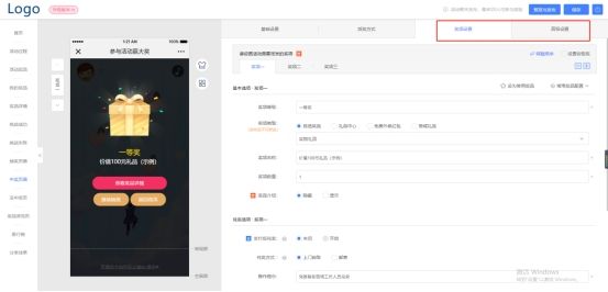 4. 而我们在【奖项设置】与【高级设置】选项框中,还可针对参与H5小游戏赢取的奖品、兑奖方式以及商家信息等进行编辑与完善。