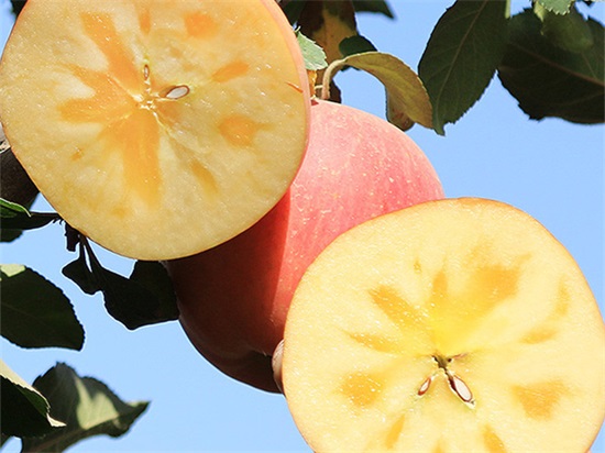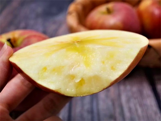 真的好似在吃冰糖,切开苹果之后,会发现有一块糖分沉底的地方,叫做冰晶,这里收缩聚集了大部分糖分,浓郁的香味,沁人心脾,除了甜度高,水分也充足,这种 冰糖心的苹果,离开新疆阿克苏,几乎再也找不到。