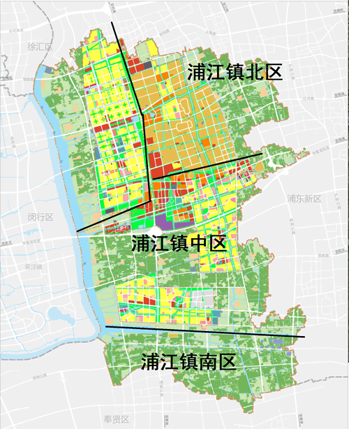 在上海市主城区的范围内,并不包括闵行区浦江镇,但它却已经可以说是“准主城区”。从下面的图中可以看出,闵行区浦江镇的颜色有一些不同,而且它位于上海市中心的正南侧。