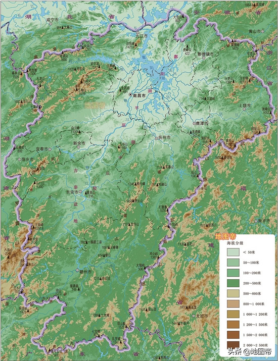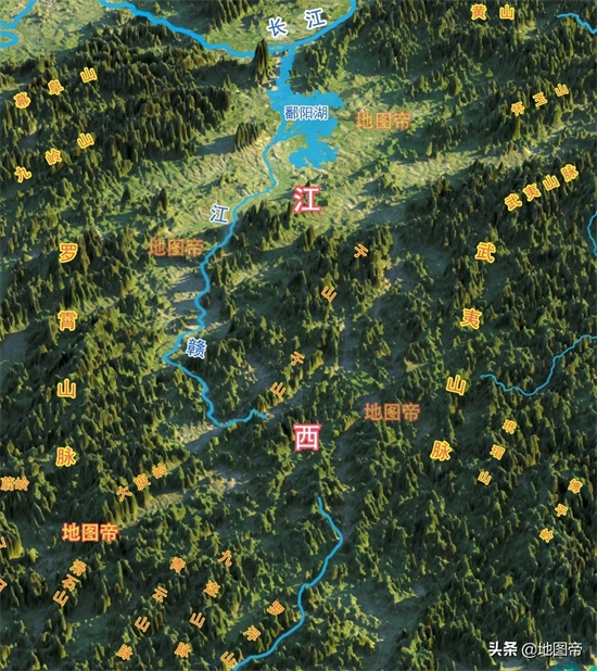 江西省的地形比较封闭,东、西、南三面环山,东北方向与安徽、浙江交界处有怀玉山、黄山等山脉,东南方向与福建之间有绵延五百多公里的武夷山脉,南面与广东之间有著名的南岭,西面与湖南之间是罗霄山山脉,北面与湖北之间除了长江外,在西北部还有慕阜山。