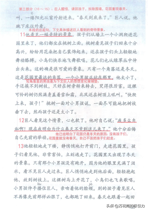 第三部分(10-15自然段):发现原因后,巨人欢迎孩子,花园又充满快乐。