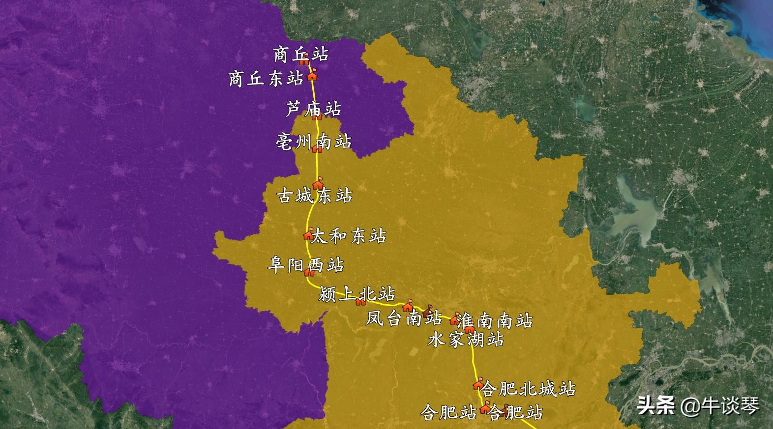 今天给伙伴们带来的是商合杭高速铁路线路图: