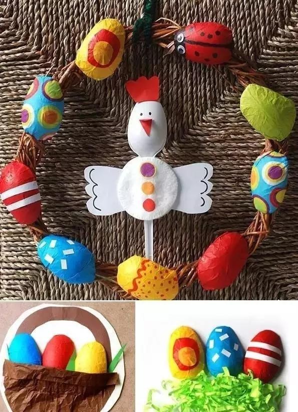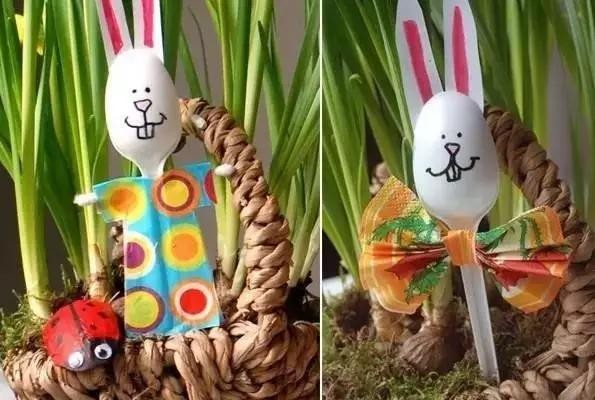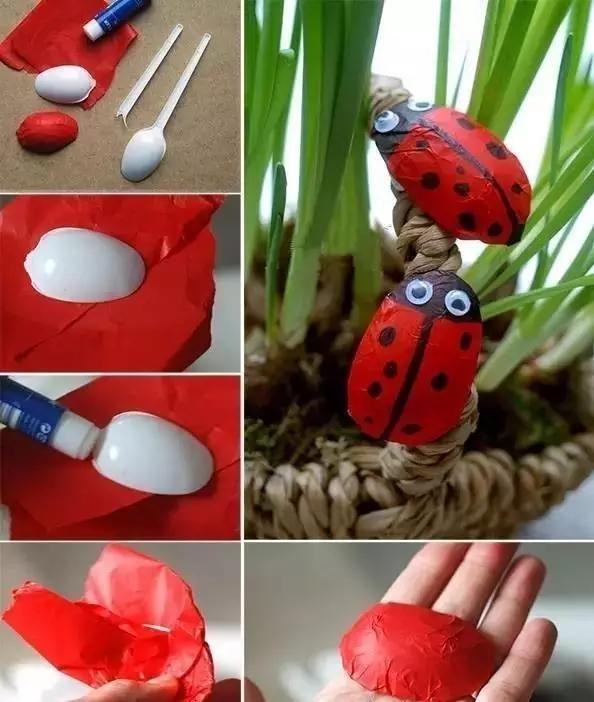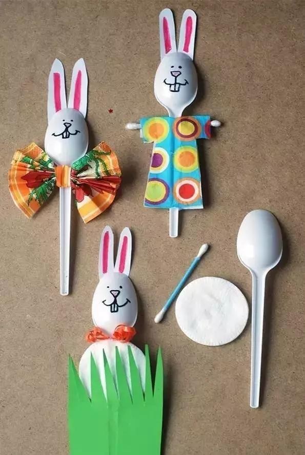 准备材料:塑料勺子、彩色薄纸、彩纸、固体胶、卸装棉圆形、塑料小眼睛、笔、剪刀