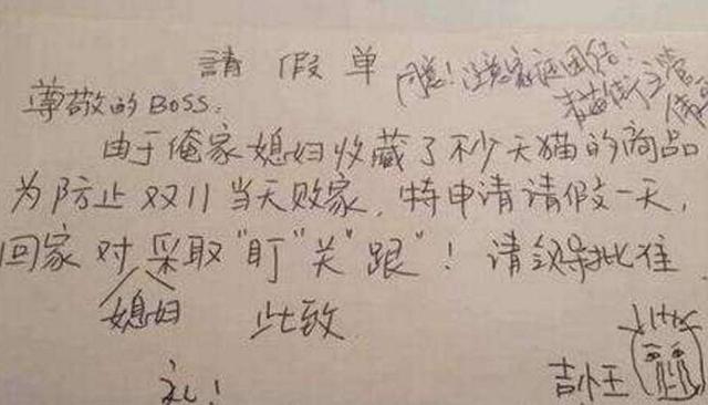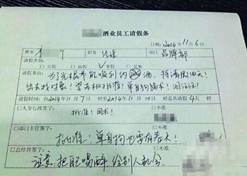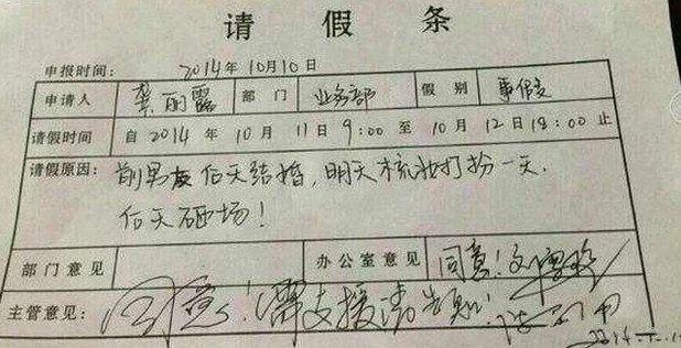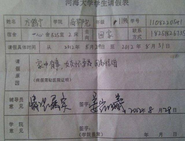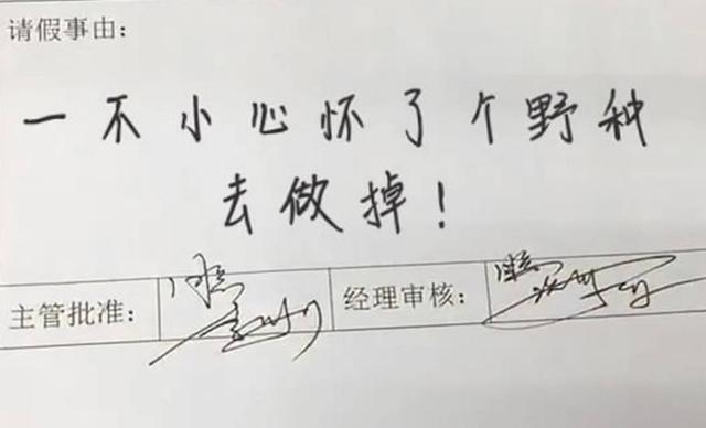 家中有事,女友怀孕,回家结婚,这个理由也是没谁了,这位兄弟难道也是先上车后买票。请假条超有逼格,不要在吃饭的时候看,怕你忍不住会笑喷!