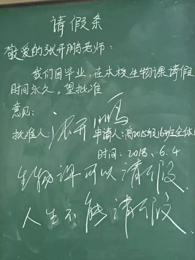 我们因毕业,在本校生物课请假时间永久,望批准。”而老师的批准写下了“生物课可以请假,人生不能请假!”以此激励学子。