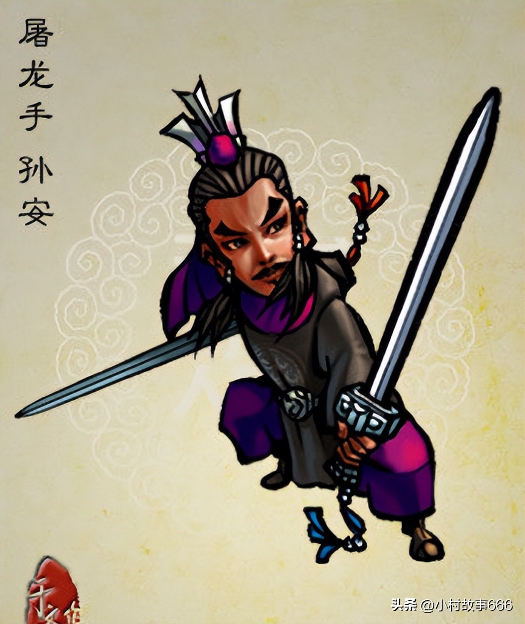 田虎手下有一员大将孙安,绰号“屠龙手”,此人“身长九尺、腰大十围,颇知韬略,臂力过人,学得一身出色的好武艺。”他曾与秦明战了个不分上下,在卢俊义马前大战一百回合不落下风。可以说平生未遇对手。