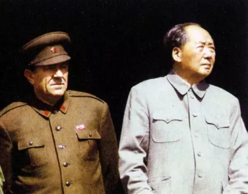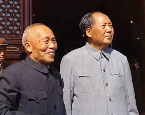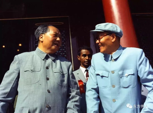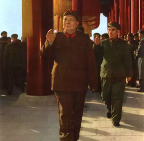 毛主席与阿尔巴尼亚国防部长巴卢库在天安门城楼上。