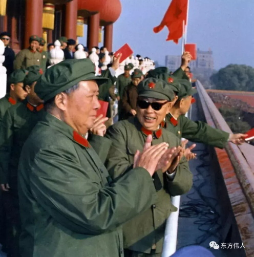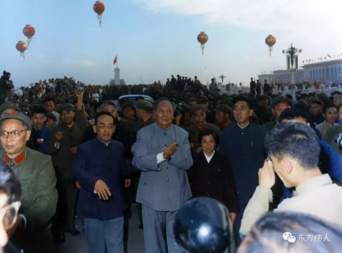毛主席在天安门城楼与首都军民欢度国庆节。