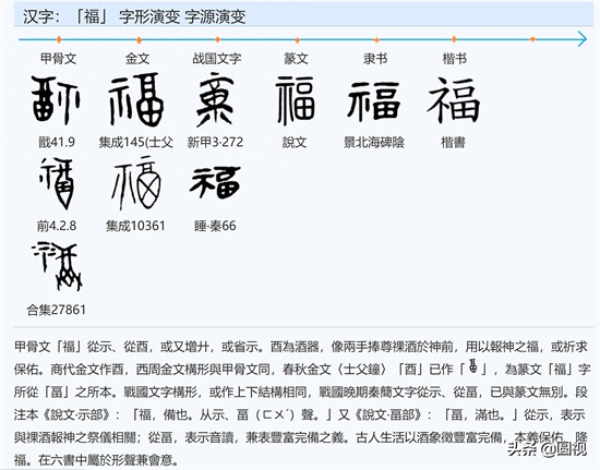甲骨文「福」從示、從酉,或又增廾,或省示。酉為酒器,像兩手捧尊祼酒於神前,用以報神之福,或祈求保佑。商代金文作酉,西周金文構形與甲骨文同,春秋金文〈士父鐘〉「酉」已作「」,為篆文「福」字所從「畐」之所本。戰國文字構形,或作上下結構相同,戰國晚期秦簡文字從示、從畐,已與篆文無別。