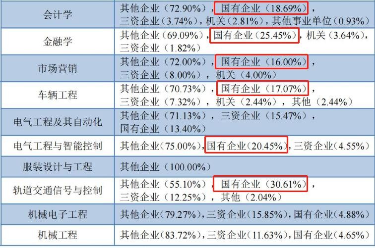 各专业里面电子信息,能源与动力,通信工程,播音主持艺术,会计学,金融学,市场营销,车辆工程,电气工程,轨道交通信号,机械等专业进入国企的比例相对较高。