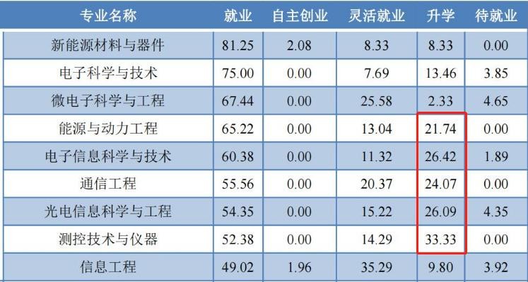 在各专业里测控,光电,通信,电子信息,能源等专业的考研率较高。
