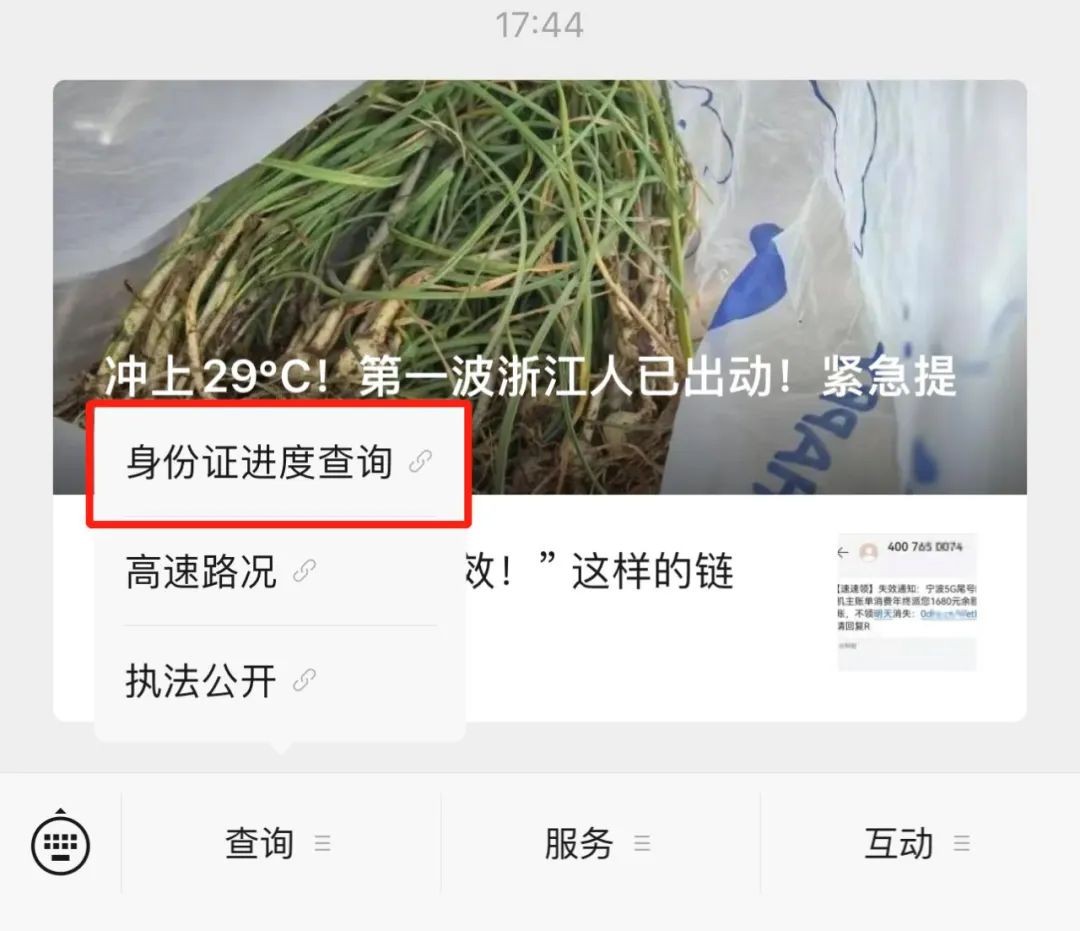 点击“浙江公安”微信公众号—“查询”—“身份证进度查询”—输入受理单号。