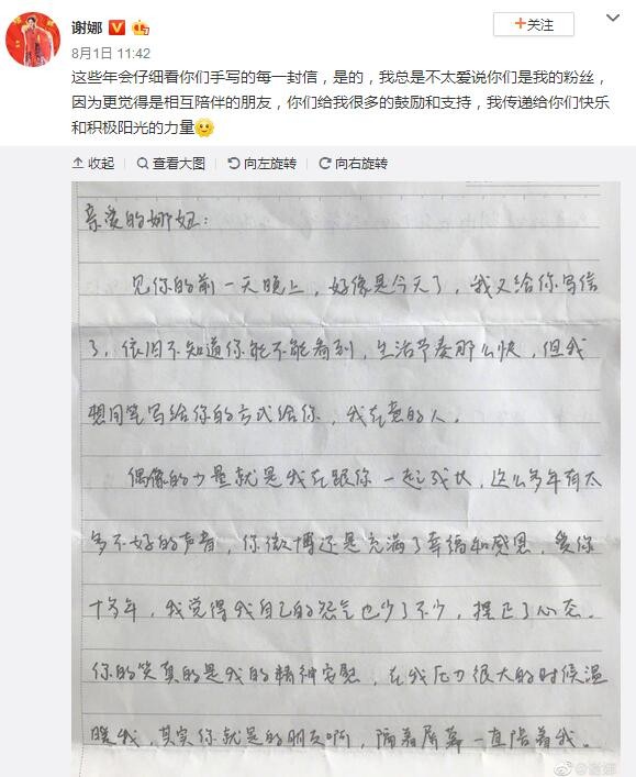 谢娜在微博中写道:这些年会仔细看你们手写的每一封信,是的,我总是不太爱说你们是我的粉丝,因为更觉得是相互陪伴的朋友,你们给我很多的鼓励和支持,我传递给你们快乐和积极阳光的力量。