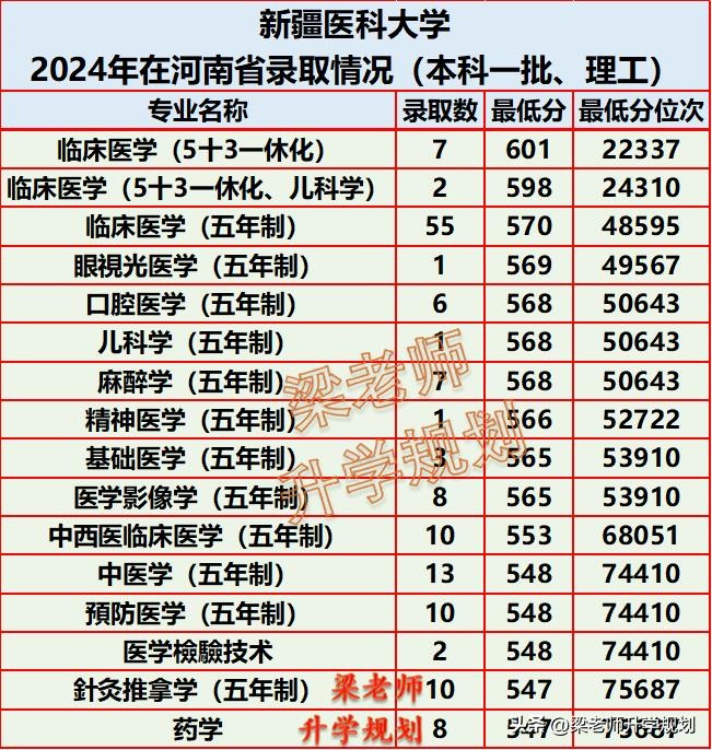 新疆医科大学2024年分省分专业录取分数