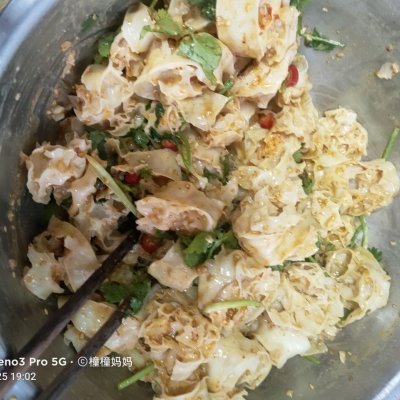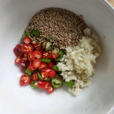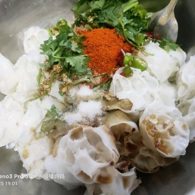 6、都放面藕里,放入生抽,香油,香菜,醋,盐,辣椒粉,烧热油浇辣椒面里