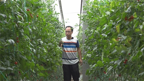 明村镇大黄堡村樱桃西红柿种植基地里,种植户吴仁杰在劳作。