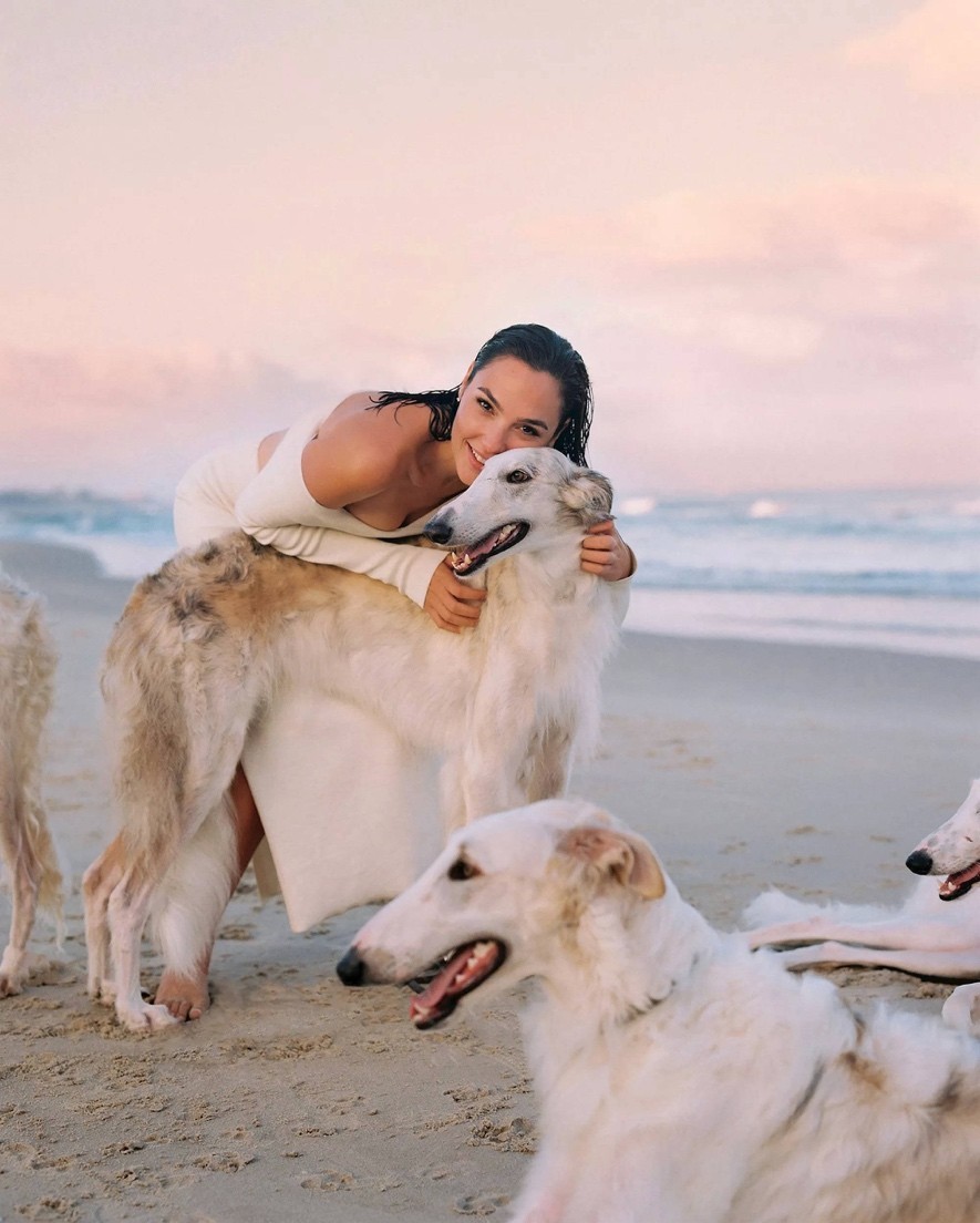 盖尔加朵身穿一字领白色长裙,与她身边的一群狗狗亲密地互动了起来,满脸笑容的加朵看上去十分的可爱。