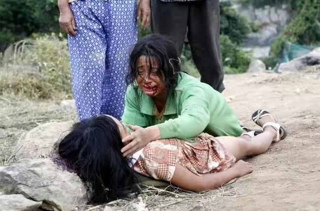 然后让人猝不及防地,金福南拿起了锈迹斑斑的镰刀,卯足了劲,猛劈下来,“噗”一声闷响,镰刀插入其中一个老女人的脖子,鲜血直流。