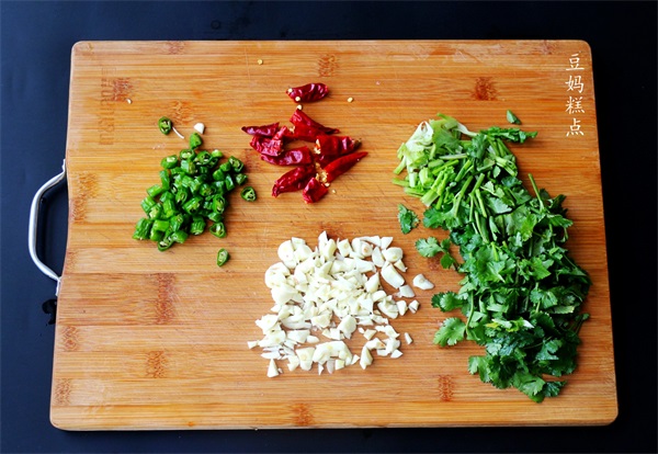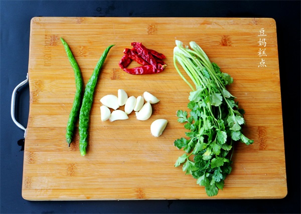 青椒、干辣椒、大蒜、香菜分别切好备用。