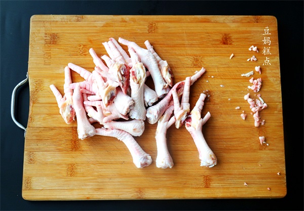 1、鸡爪洗净后,切去鸡甲,并从中间肉厚的地方剁开,剁成两瓣。