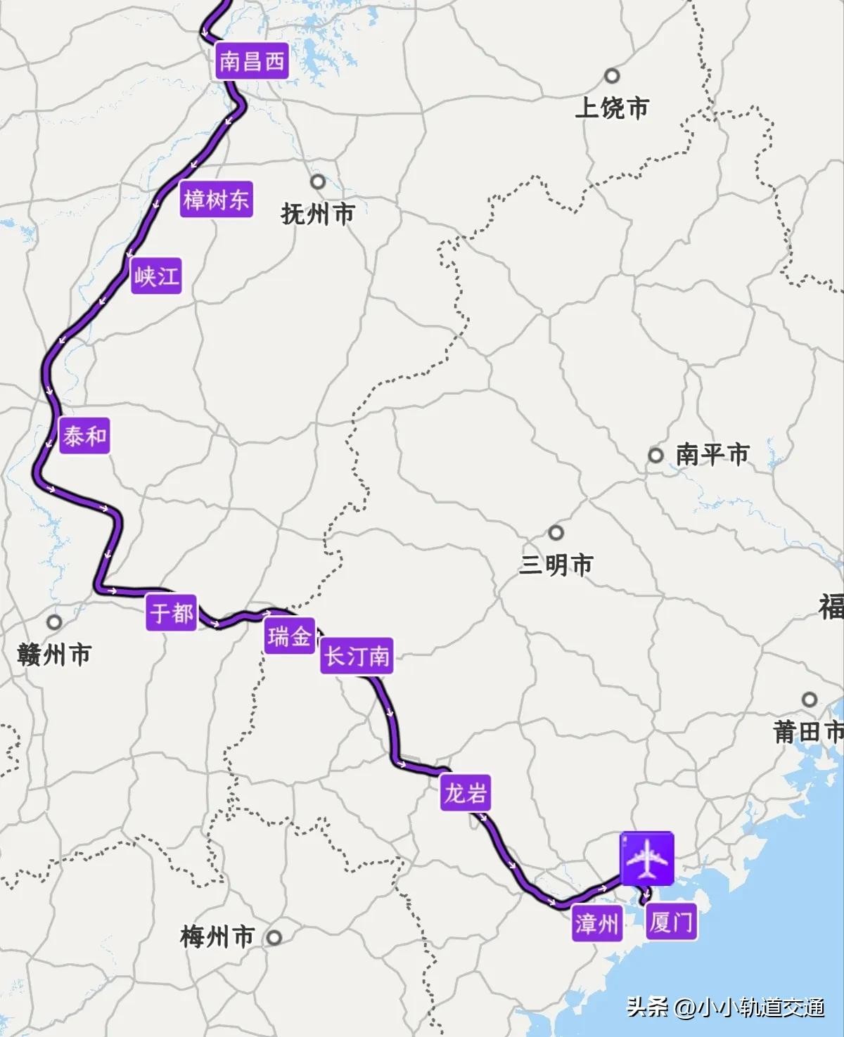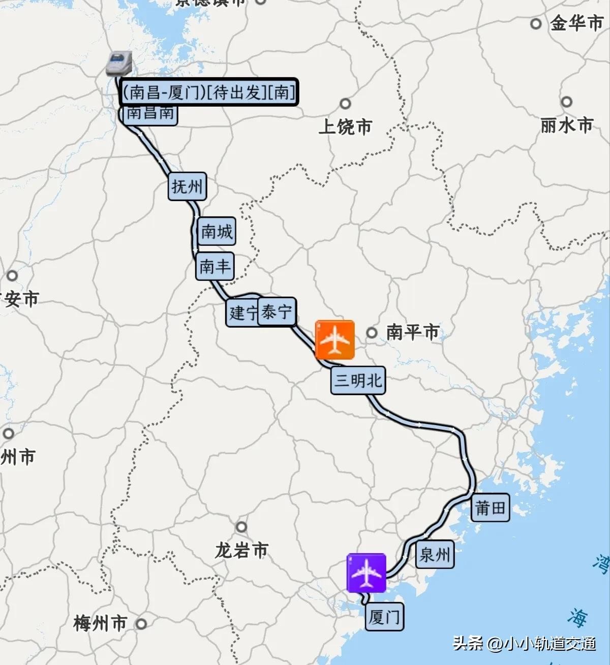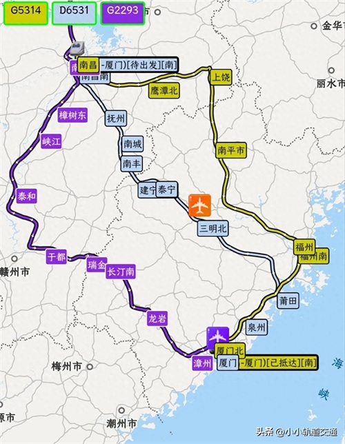 这三条线路的走向完全不同,涵盖了南北中三个方向,其中第一条是G5314次列车行走的路线,大致为南昌出发后经沪昆高铁上的鹰潭和上饶前往福建南平,然后转向省会福州,最后通过沿海通道前往厦门,这条线全程耗时4小时7分钟,全程二等座396元。这条线到厦门时间最短,当然票价也是最高的。