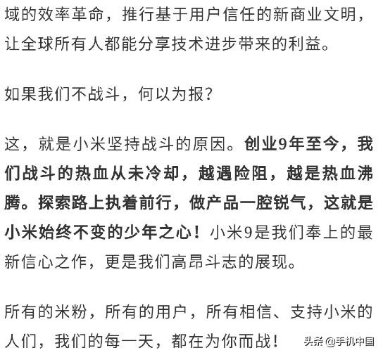 【手机中国新闻】2月13日10点,小米年度旗舰小米9正式官宣,这款将于2月20日发布的新品吸引了众多人的关注,好看又能打的口号更是深入人心。从宣传海报来看,小米高调宣布“为你而战”,这也成为了小米9的主旋律,那么到底是为谁而战呢?小米9官宣之后,雷军也发千字长文,向米粉“呐喊”,小米到底在为谁而战!