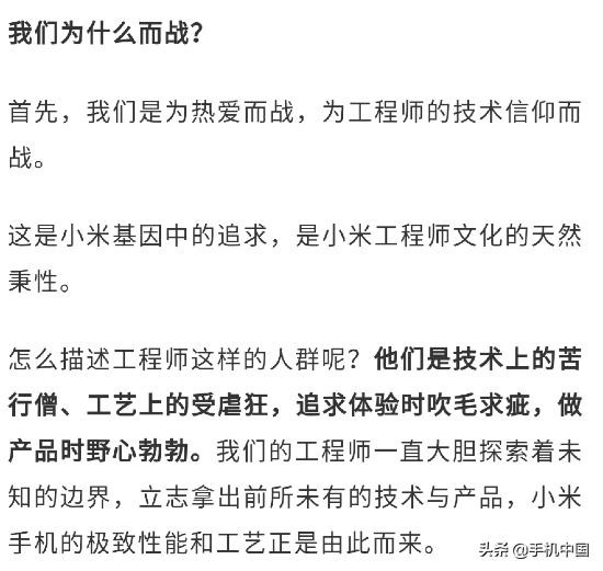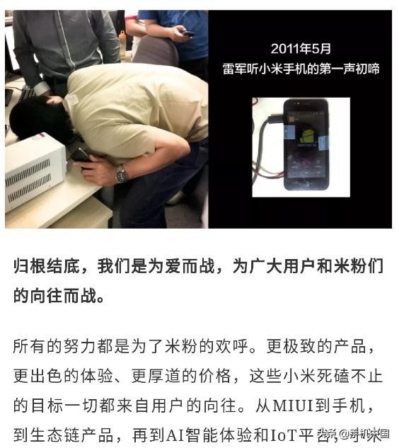小米为热爱而战、为工程师的技术信仰而战。正是小米工程师在技术上的“吹毛求疵”,工艺上的精心打磨,以及所拥有的勃勃野心,才做出了一代又一代小米的精品旗舰。不管是最强性能的小米1还是不锈钢中框的小米4,亦或是首开全面屏设计的小米MIX,小米工程师的探索从未停止。雷军还附上了2011年时自己听小米手机的第一声初啼的照片,充满了情怀已经热爱。